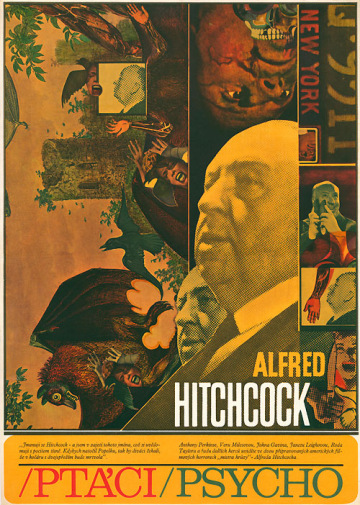 Zdeněk Ziegler na tomto plakátu ke dvěma Hitchcockovým mistrovským hororům Ptáci a Psycho rozehrál kolážovou hru, do které zakomponoval i samotného režiséra.